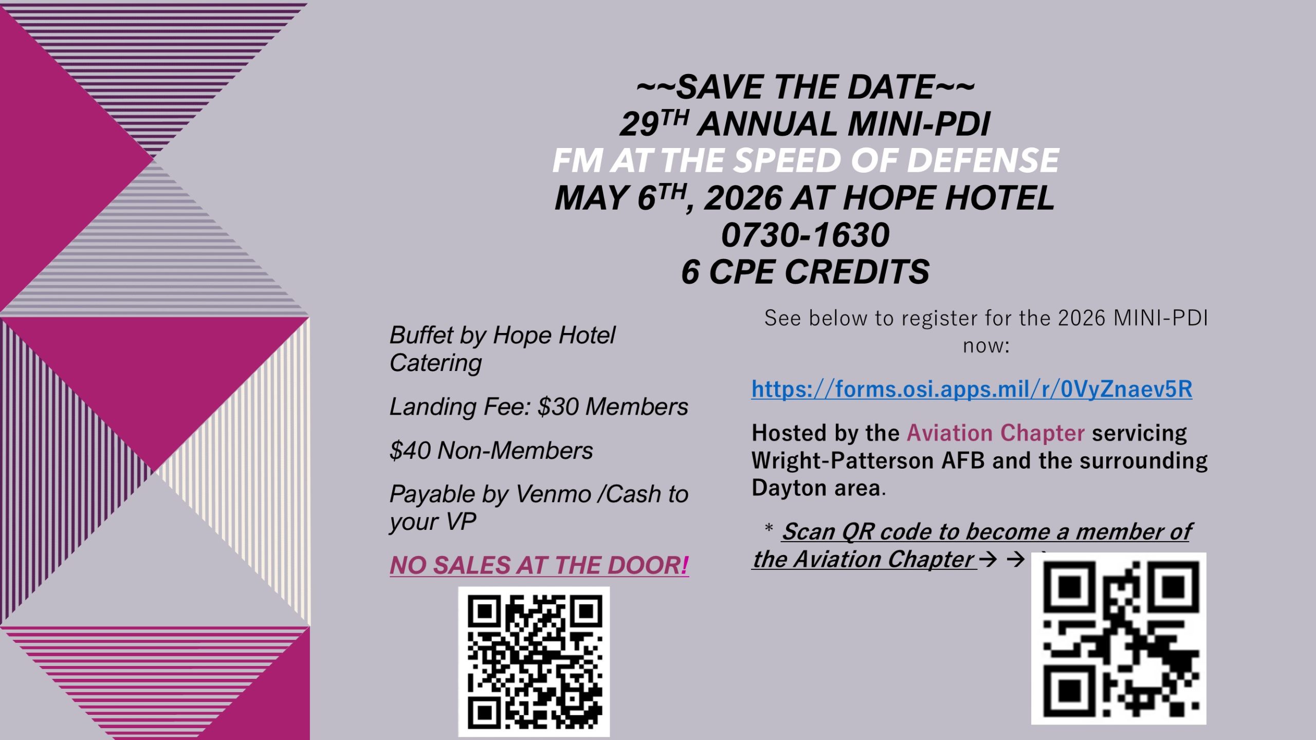 We are located at Wright Patterson Air Force Base, Ohio. If you are new to Wright Patterson and work in or support the field of financial management, or you are just interested in military comptrollership, we encourage you to become a chapter member. Click here for details. Also, to see the current Chapter calendar of events, please click here.